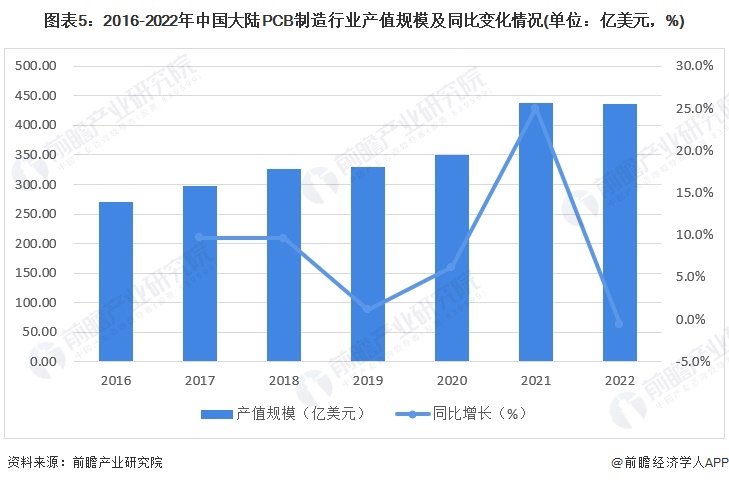 2016-2022年,中國PCB產(chǎn)值規(guī)模整體呈現(xiàn)波動上漲的態(tài)勢。2021年,由于需求復(fù)蘇、技術(shù)要求升級以及原材料價格大幅度上漲等因素影響,推動中國PCB產(chǎn)值強勁增長。2022年,中國PCB產(chǎn)值規(guī)模達到435.5億美元(按照美元口徑),同比下降0.7%。