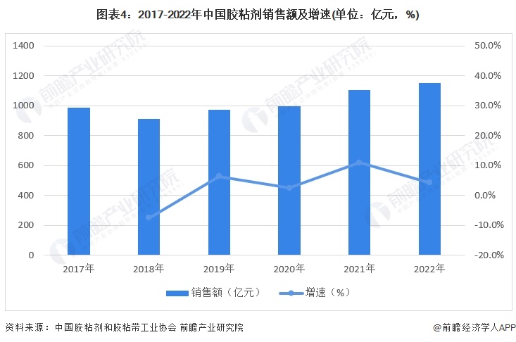 我國膠粘劑行業(yè)的生產(chǎn)規(guī)模迅速擴大,產(chǎn)品產(chǎn)銷量保持高速增長。據(jù)中國膠粘劑和膠粘帶工業(yè)協(xié)會統(tǒng)計,2022年我國膠粘劑行業(yè)總產(chǎn)量約788.4萬噸,銷售額約1151.4億元人民幣,分別比2021年增長3.30%和4.37%。隨著新能源行業(yè)的崛起,光伏、風(fēng)電、動力電池對于粘膠劑的需求占比越來越高,同時行業(yè)需求增速也十分快速。