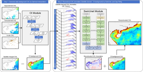 該研究結(jié)合最優(yōu)插值(OI)方法和深度學(xué)習(xí)網(wǎng)絡(luò)框架(SwinUnet),構(gòu)建了基于數(shù)據(jù)異常預(yù)期方差的深度學(xué)習(xí)模型——OI-SwinUnet。該方法利用最優(yōu)插值,基于空間鄰域信息,融合衛(wèi)星觀測(cè)和現(xiàn)場(chǎng)觀測(cè)數(shù)據(jù),并利用SwinUnet對(duì)大區(qū)域長(zhǎng)時(shí)序的遙感觀測(cè)時(shí)間序列數(shù)據(jù)進(jìn)行多尺度特征學(xué)習(xí),重建缺失的葉綠素a濃度數(shù)據(jù),進(jìn)而獲得南海區(qū)域逐日1km海表葉綠素產(chǎn)品。