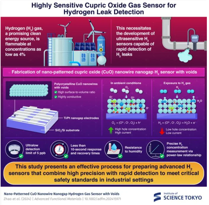 本研究提出了一種制備先進氫氣(H₂)傳感器的有效工藝,該傳感器兼具高精度與快速檢測的特點,能夠滿足工業(yè)環(huán)境中的關(guān)鍵安全標(biāo)準(zhǔn)。圖片來源:東京科學(xué)研究所