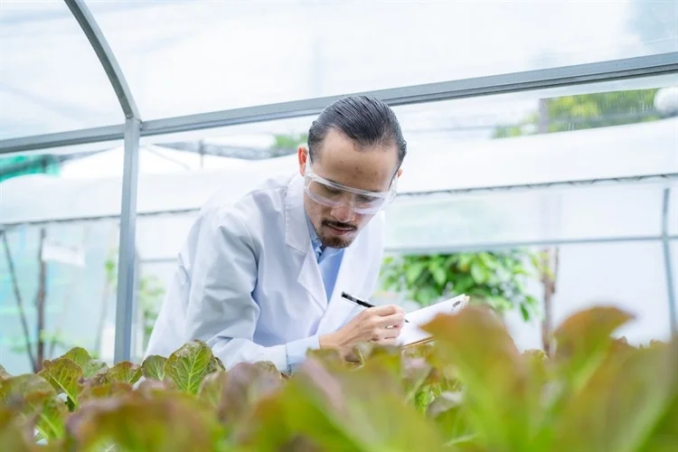 一位戴著護目鏡、穿著白色實驗服的男性科學(xué)家正在觀察植物,并用筆做記錄。