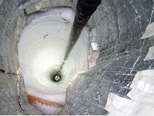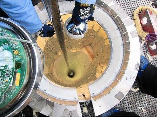 冰立方增強(qiáng)型熱水鉆的鉆頭從冰層中顯露出來。鉆出一個(gè)冰洞需要耗費(fèi)18170升的汽油,并融化掉757立方米的冰塊。