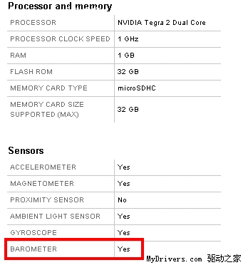 在摩托羅拉的開發(fā)者頁面中,摩托羅拉給出了Xoom的詳細配置,其中傳感器芯片中竟然出現(xiàn)了氣壓感應裝置,這在手機和平板機設備中非常少見。這種感應裝置可以通過對周圍的氣壓進行感測,從而提供更準確的天氣信息以及所處高度。