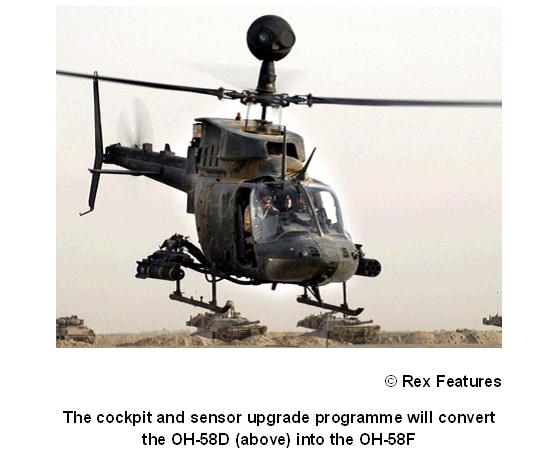 據(jù)英國(guó)《飛行國(guó)際》2011年1月4日?qǐng)?bào)道,美國(guó)陸軍已做出了啟動(dòng)OH-58D升級(jí)項(xiàng)目的決定,該項(xiàng)目?jī)r(jià)值19.8億美元,是OH-58D在服役的20年間首個(gè)主要的技術(shù)升級(jí)項(xiàng)目。
