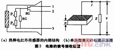 本系統(tǒng)采用RE200B熱釋電紅外線傳感器作為接收人體紅外輻射的核心元件,是整個電路的信號接收部分。它具有方向識別的功能,能以非接觸形式檢測出人體輻射的紅外線能量的變化,并將其轉(zhuǎn)換成電壓信號輸出。將這個電壓信號加以放大,便可驅(qū)動各種控制電路。