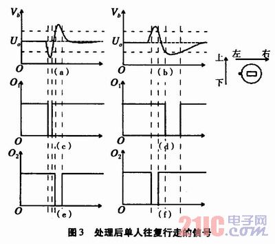紅外熱釋電傳感器BE200B的輸出信號非常微弱,且信號中含有因環(huán)境引起的噪聲信號,所以必須對信號進行濾波放大。在電路中使用LM324構(gòu)成280倍放大電路,并通過電位器R3調(diào)節(jié)偏置電壓,使靜態(tài)輸出電壓盡可能平穩(wěn)于U0(圖3),但此時信號受環(huán)境溫度影響無法保證穩(wěn)定性,所以增加一級微分電路,通過調(diào)節(jié)電位器R11使微分電路靜態(tài)輸出不受環(huán)境溫度影響穩(wěn)定于U0附近,當有人或紅外源從左右方向經(jīng)過傳感器窗口時可以看到微分電路輸出Vb會隨人通過方向不同而不同(圖3(a)(b))。