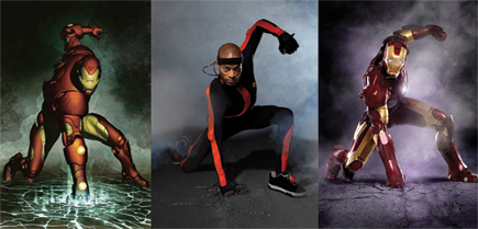 穿戴著Xsens公司MVN Motion Capture彈力纖維套裝的演員(中間),身上鑲滿(mǎn)了ADI公司的MEMS慣性傳感器。他模仿傳奇漫畫(huà)"鋼鐵俠"插圖中的特征手勢(shì)(左),作為創(chuàng)作派拉蒙影業(yè)公司"鋼鐵俠2”(右)動(dòng)畫(huà)的基礎(chǔ)。