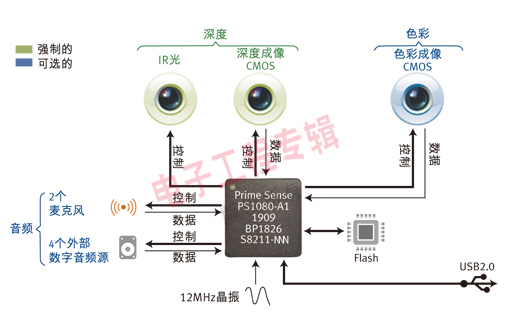微軟的Xbox Kinect以PrimeSense參考設(shè)計(jì)為基礎(chǔ),使用兩個(gè)CMOS成像器(一個(gè)用于紅外光,一個(gè)用于可見(jiàn)光)檢測(cè)3D深度,因此系統(tǒng)能夠輕松辨別房間內(nèi)的游戲玩家和背景物體。