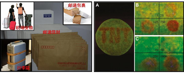 探測可疑包裹、郵件和恐怖分子隱藏在身上的炸藥一直是國際反恐和公共安全領域高度關注的課題。由于硝基爆炸物具有低蒸氣壓和高爆炸性,目前機場安檢主要依賴離子遷移譜和X射線衍射裝備,但難以做到快速、及時和低成本的探測。智能所課題組研究人員設計構建了雙發(fā)射波長的量子點比率熒光探針。探針的綠色熒光易受梯恩梯的影響發(fā)生淬滅,而紅色熒光不受影響,從而發(fā)生從綠色到紅色的顯色反應?蒲腥藛T利用指紋提取技術,進一步研發(fā)出了方便操作的梯恩梯指示試紙。當信封、合成纖維、包裹、橡皮等表面黏附肉眼看不見的梯恩梯殘留微粒時,用這種試紙簡單擦拭即可顯示顏色變化,靈敏度達到5納克/平方毫米。