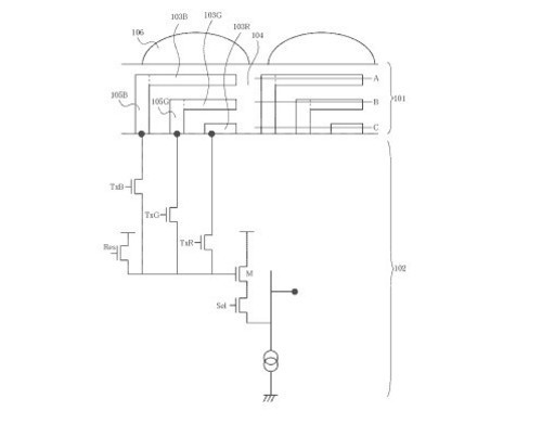 據(jù)悉,該專利技術細節(jié)公布時間為2010年6月30日。這款新型傳感器采用了目前的較為流行的背照式結構,從上至下分別為藍、綠、紅色吸收層,其上排列有光電轉換元以接受光信號。
