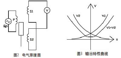 LVDT是由一個(gè)初級(jí)線圈,兩個(gè)次級(jí)線圈,鐵芯及線圈骨架,外殼等部件組成。當(dāng)鐵芯在線圈中間位置時(shí),次級(jí)線圈S1、S2所感應(yīng)的電壓相等,由于輸出是反向串接,所以輸出電壓為零(如圖2所示);當(dāng)鐵芯向上移動(dòng)時(shí),線圈S1和線圈P之間互感量增加,次級(jí)線圈S1感應(yīng)電壓V1升高,線圈S2和線圈P之間互感量減少,次級(jí)線圈S2感應(yīng)電壓V2降低,兩線圈電壓的代數(shù)和V=V1+V2,隨著鐵芯向上移動(dòng)呈線性增加。當(dāng)鐵芯向下移動(dòng)時(shí),兩線圈電壓變化相應(yīng)與之相反,V1與V2的代數(shù)和隨鐵芯向下移動(dòng)線性增加(因S1和S2線圈是反向串接),如圖3所示次級(jí)線圈電壓與鐵芯移動(dòng)距離之間關(guān)系,即輸出特性曲線。