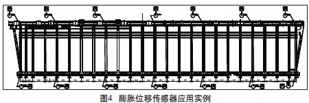 北京賽斯維測控技術(shù)有限公司推出的SensorWay系列3000XS、4000XS、5000XS傳感器已經(jīng)在冶金爐體膨脹監(jiān)測中得到實(shí)際應(yīng)用,并取得了良好的效果。如圖4所示的膨脹位移傳感器應(yīng)用實(shí)例。在某冶金爐爐體一側(cè)的上、下縱向梁上共安裝了14個(gè)膨脹位移傳感器。由于各種原因,爐子縱向梁上各點(diǎn)膨脹位移量不同,14個(gè)傳感器按照均勻分布的原則進(jìn)行布置,同樣在爐體另一側(cè)對(duì)稱安裝了14個(gè)膨脹位移傳感器,其最大行程均為0~50mm。在長方形爐體的兩個(gè)端墻側(cè)的上、下縱向梁也安裝了膨脹位移傳感器。
