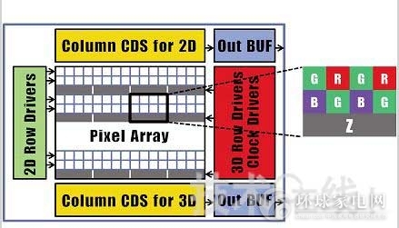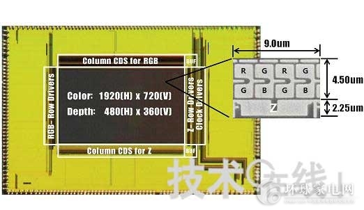 Z像素的大小為2.25μm×9.0μm,相當(dāng)于四個RGB單個像素的面積。Z像素與RGB像素相鄰,位于下側(cè)。在像素區(qū)域的上下方分別設(shè)置了用于RGB像素和用于Z像素的列線(Column)CDS電路。另外,由于有Z像素而缺失的RGB像素信息可以通過圖像處理算法進(jìn)行插值補(bǔ)償。