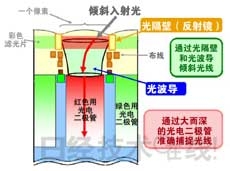 上述特點是通過以下技術實現的:[1]在微小尺寸的像素上形成大而深的光電二極管的高感光度光電二極管形成技術;[2]通過降低寄生電容提高像素放大器的感光度,降低晶體管噪聲的半導體微細加工技術;[3]攝像頭模塊、鏡頭與松下元器件自主開發(fā)的聚光構造的優(yōu)化匹配技術。