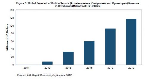 圖:超極本中的全球運動傳感器(加速度計,羅盤與陀螺儀)營業(yè)收入預測(以百萬美元為單位)