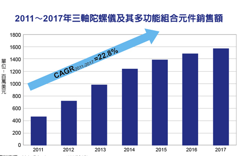 三軸陀螺儀(Gyroscope)及其多功能組合(Combo)元件銷售量將強(qiáng)勁增長(zhǎng)。YoleDeveloppement研究報(bào)告指出,在消費(fèi)性應(yīng)用需求成長(zhǎng)的驅(qū)動(dòng)下,三軸陀螺儀及其多功能組合元件的銷售額,將從2011年的4億5,800萬(wàn)美元,擴(kuò)大到2017年的15億7,000萬(wàn)美元,成長(zhǎng)將近四倍,年復(fù)合成長(zhǎng)率(CAGR)亦高達(dá)22.8%。