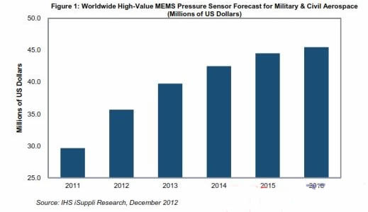 據(jù)IHS iSuppli公司的MEMS市場簡報(bào),在高價(jià)值的軍用與航空領(lǐng)域,MEMS壓力傳感器市場今年將以兩位數(shù)的速度強(qiáng)勁增長,而且將來在多個(gè)利潤豐厚的應(yīng)用領(lǐng)域有充足的擴(kuò)張空間。