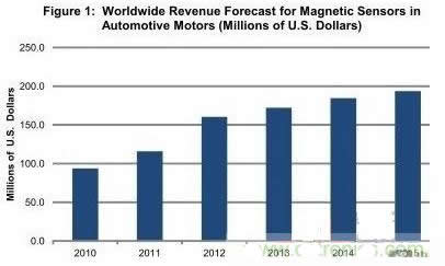 最新預(yù)計(jì)硅磁傳感器在汽車電機(jī)中的應(yīng)用率將急增。由于能夠改善汽車安全性、便利性和燃油效率,硅磁傳感器在汽車電機(jī)中的應(yīng)用將快速增長,該市場的銷售額將在2012年增長近40%。2012年汽車電機(jī)領(lǐng)域的磁傳感器銷售額將達(dá)到1.603億美元,延續(xù)最近三年的穩(wěn)健增長勢頭。盡管2012年以后銷售額增長速度將會(huì)放緩到一位數(shù),但2010-2015年的復(fù)合年度增長率仍將達(dá)到16%。到2015年,汽車電機(jī)領(lǐng)域的磁傳感器銷售額將上升到1.936億美元。