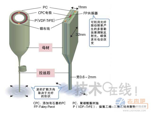 帶麥克風(fēng)與揚(yáng)聲器功能的光纖母材構(gòu)造。形狀有筒狀和磁帶狀兩種。麥克風(fēng)的增益方向以及揚(yáng)聲器的發(fā)聲方向因形狀不同而異。磁帶狀光纖還裝有可使波長(zhǎng)1.55μm附近的光線發(fā)生強(qiáng)烈反射的FP共振器,可隨振動(dòng)頻率調(diào)制反射波。
