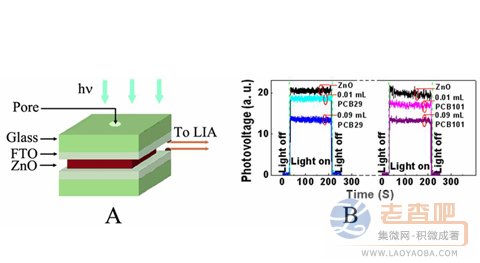 該傳感器的結(jié)構(gòu)非常簡單,由兩片導(dǎo)電玻璃和中間夾著的一薄層多孔氧化鋅粉末構(gòu)成(圖 A)。在光照面一側(cè)的導(dǎo)電玻璃中間有一個小圓孔,是PCBs進入氧化鋅粉末層的通道。通過鎖相放大器與導(dǎo)電玻璃相連來測量其SPV。該系統(tǒng)的靈敏度較高,可以檢測出微弱的SPV信號變化。之所以采用多孔氧化鋅粉末,是為了增強對PCBs的富集作用,從而提高檢測的靈敏度。由于該傳感器在光照后幾秒鐘便可獲得穩(wěn)定的SPV信號(圖B),因而具有較短的分析時間,有望用于PCBs的快速檢測。