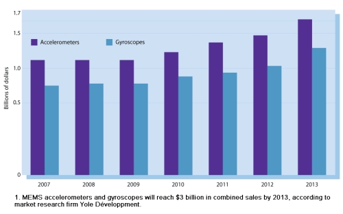 MEMS加速度計和陀螺儀是正在迅速增長的市場。市場研究公司Yole Developpement預測,2013年MEMS加速度計和陀螺儀的復合市場將達約30億美元(圖1)。而在2008年該市場是18.5億美元,當時全球大約生產(chǎn)了8.59億個MEMS加速度計和陀螺儀。