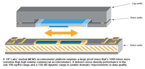 惠普(HP)實驗室的超靈敏慣性MEMS加速度計平臺(圖6)是MEMS的一個重要發(fā)展,它比大批量商用加速度計敏感1,000倍以上,且成本低、體積小。它具有亞100 ng√Hz范圍的噪聲密度表現(xiàn)以及130dB的動態(tài)范圍從而大幅提高了數(shù)據(jù)質(zhì)量,這一切要歸功于使用了大的檢測質(zhì)量(proof mass)