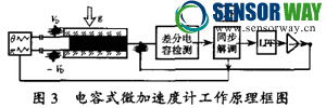 硅微電容式加速度計(jì)的工作原理如圖3所示。 在受到加速度作用時(shí),在慣性力-作用下,檢測(cè) 質(zhì)量塊在z方向運(yùn)動(dòng)。這使動(dòng)極板兩側(cè)的電容Ca、 Cb發(fā)生了變化。兩側(cè)電容的差值(2倍于單側(cè)的變 化量)經(jīng)激勵(lì)正弦波信號(hào)調(diào)制,由電容檢測(cè)器檢出。