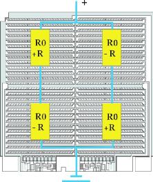 現(xiàn)代傳感器系統(tǒng)主要由兩個元件組成 —基本傳感器和信號處理專用集成電路 (ASIC)(圖 1)。現(xiàn)已證明,后來由 Lord Klevin 于 1857 年發(fā)現(xiàn)的各向異性磁阻效應(yīng)特別適用于檢測磁場。首先考慮通常具有多種磁疇結(jié)構(gòu)的鐵磁性材料。這些稱之為韋斯磁疇的結(jié)構(gòu),其內(nèi)部磁化的方向彼此不同。如果將這種材料平鋪為一薄層,那么磁化矢量處于材料層平面方向。另外,可較精確地假設(shè)只存在一個磁疇。當這種元件暴露于外部磁場中時,后者會改變內(nèi)部磁化矢量的方向。如果同時一股電流通過該元件,就會產(chǎn)生電阻(圖 2),這取決于電流和磁化之間的角度。當電流和磁化方向彼此成直角時,電阻最小,當二者平行時,電阻最大。電阻變化的大小取決于材料。鐵磁性材料的性質(zhì)也決定對溫度的依賴性。電阻最大變化為 2.2% 并且對溫度變化反應(yīng)良好的最佳合金是 81% 的鎳和 19% 的鐵組成的合金。恩智浦所有傳感器系統(tǒng)中的基本傳感器都采用這種強磁鐵鎳合金。在惠斯登電橋電路中單獨配置幾個 AMR 電阻,以增強輸出信號并改善溫度反應(yīng)特性。此電路也可在制造過程中進行微調(diào)。圖 3 顯示如何在裸片上配置 AMR 元件。