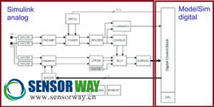 確定磁場(chǎng)之后是傳感器系統(tǒng)仿真。AMR 元件的電阻變化是各向異性磁阻效應(yīng)的直接結(jié)果。這樣,磁場(chǎng)仿真的結(jié)果會(huì)導(dǎo)致代表信號(hào)處理中輸入信號(hào)的電阻發(fā)生變化。對(duì)模擬前端進(jìn)行建?刹捎 Simulink。這種行為模型是概念設(shè)計(jì)的產(chǎn)物,標(biāo)志著產(chǎn)品開發(fā)的起點(diǎn)。每個(gè) Simulink 塊對(duì)應(yīng)一個(gè)模擬信號(hào)處理組件,例如放大器或過(guò)濾器。但是,尚未考慮模擬組件的控制部分,這由數(shù)字系統(tǒng)實(shí)現(xiàn)。HDL 設(shè)計(jì)則仿真通過(guò)數(shù)字方法實(shí)現(xiàn)的功能,而且在完成產(chǎn)品開發(fā)之后就會(huì)最終成形。因此,整體系統(tǒng)仿真是 Simulink 對(duì)模擬組件的行為模型以及ModelSim 對(duì) HDL 設(shè)計(jì)的共同仿真(圖8)。可通過(guò)仿真從概念階段順利過(guò)渡到HDL 設(shè)計(jì)及后續(xù)階段。在共同仿真中,可用 ModelSim 中部署的 Verilog 代碼逐漸代替 Simulink 參考模型,從而可逐項(xiàng)驗(yàn)證 HDL 設(shè)計(jì)?沙掷m(xù)進(jìn)行此過(guò)程,直到在 Verilog 中實(shí)現(xiàn)整個(gè)數(shù)字部件,而模擬系統(tǒng)部件仍保持為 Simulink模型。此工具組合也已證明對(duì) IC 評(píng)估同樣有用。自始至終使用這種工具可以更容易理解 IC 行為,并可創(chuàng)建用來(lái)分析和解釋任何錯(cuò)誤的框架。這些工具的主要好處在于,能夠更快速、更準(zhǔn)確地答復(fù)客戶的查詢,以及更好地了解與環(huán)境條件相關(guān)的傳感器功能。