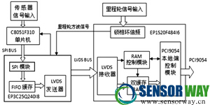 系統(tǒng)總體邏輯設(shè)計(jì)框圖如圖3所示。系統(tǒng)運(yùn)行過(guò)程中,里程輪會(huì)隨著檢測(cè)器運(yùn)行的距離變化發(fā)出周期性的方 波信號(hào),主控FPGA通過(guò)倍頻的方式使其滿足設(shè)計(jì)要求的 采樣頻率,并行發(fā)送至前端數(shù)據(jù)采集系統(tǒng),確保前端各單片 機(jī)同時(shí)進(jìn)行A/D轉(zhuǎn)換。探頭內(nèi)由單片機(jī)負(fù)責(zé)依次A/D轉(zhuǎn) 換5只霍爾傳感器感應(yīng)到的磁通信號(hào),通過(guò)SPI總線將采 集到的數(shù)據(jù)發(fā)送回集束器端的FPGA;5組集束器端的FP-GA通過(guò)LVDS串行收發(fā)器同時(shí)將前端數(shù)據(jù)發(fā)送到主控FP-GA,當(dāng)主控FPGA內(nèi)部緩存滿后,發(fā)送使能信號(hào)到PCI9054 橋芯片,通知PC104工控機(jī)讀取FPGA的內(nèi)部緩存數(shù)據(jù),并 將數(shù)據(jù)及時(shí)存儲(chǔ)到固態(tài)硬盤設(shè)備中。