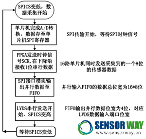 集束器端FPGA作為SPI總線傳輸?shù)闹鳈C(jī)端,提供2 MHz的SPI時(shí)鐘信號(hào),16路單片機(jī)做為從機(jī)端,同時(shí)接收 SPI時(shí)鐘信號(hào)并發(fā)送數(shù)據(jù)。基于本系統(tǒng)龐大的前端傳感器 數(shù)量與單向的數(shù)據(jù)傳輸結(jié)構(gòu),只采用了主機(jī)輸入/從機(jī)輸出 數(shù)據(jù)線MISO, SPI時(shí)鐘線SCK和使能信號(hào)線SPICS 3的三 線形式即可完成SPI傳輸。SPICS信號(hào)默認(rèn)為高電平,會(huì)根 據(jù)里程輪方波信號(hào)翻轉(zhuǎn)變?yōu)榈碗娖剑瑔纹瑱C(jī)接收到低電平 后開(kāi)始A/D轉(zhuǎn)換數(shù)據(jù)和SPI傳輸,在單次SPI數(shù)據(jù)傳輸中 SPICS始終保持低電平狀態(tài)。通過(guò)設(shè)置異FIFO緩存模塊 讀寫(xiě)時(shí)鐘和進(jìn)出數(shù)據(jù)位寬,可協(xié)調(diào)SPI接收模塊與鐘和進(jìn)出數(shù)據(jù)位寬,可協(xié)調(diào)SPI接收模塊與LVDS發(fā) 送器數(shù)據(jù)不同位寬和數(shù)據(jù)傳輸頻率不同的問(wèn)題,前端SPI 數(shù)據(jù)傳輸?shù)牧鞒倘鐖D4所示。