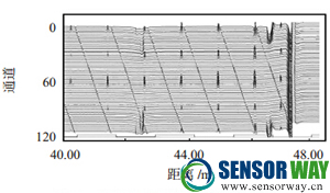 圖5為通過(guò)軟件分析得出的40.00~48.00m的其中120路管道漏磁檢測(cè)原始數(shù)據(jù)圖,橫軸