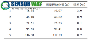 從對(duì)比結(jié)果可知,測(cè)量出的管道焊縫位置與實(shí)際焊縫 位置基本一致,且通過(guò)分析各通道傳感器電信號(hào)變化的長(zhǎng) 度幅度,可如實(shí)反映出實(shí)際管壁上缺陷的大小深度,說(shuō)明系 統(tǒng)數(shù)據(jù)傳輸存儲(chǔ)穩(wěn)定可靠,可實(shí)際應(yīng)用于813 mm的大管徑 管道的檢測(cè)任務(wù)。