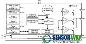 圖 2:ADT7410 將三角積分轉(zhuǎn)換器與溫度傳感器集成在一起,可實(shí)現(xiàn)低功耗可配置分辨率。