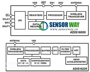 ADIS16000 和 ADIS16229 的這種組合構(gòu)建了一個(gè)感應(yīng)網(wǎng)絡(luò),其中 ADIS16000 提供網(wǎng)關(guān)功能,用于管理由 ADIS16229 傳感器單元組成的網(wǎng)絡(luò)。