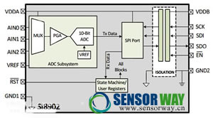 圖 1:Si8900 采用專有 CMOS 工藝,將電隔離器和數(shù)據(jù)轉(zhuǎn)換器組合在一起,形成低功耗傳感器節(jié)點(diǎn)。