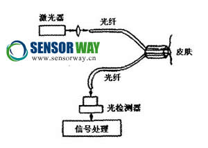 發(fā)光頻率為f的激光經(jīng)透鏡,光纖被送到表皮組織。對于不動的組織,例如血管壁,所反射的光不產(chǎn)生頻移;而對于皮層毛細(xì)血管里流速為 的紅細(xì)胞,反射光要產(chǎn)生頻移,其頻率變化為△f;發(fā)生頻移的反射光強度與紅細(xì)胞的濃度成比例,頻率的變化值可與紅細(xì)胞的運動速度成正比。發(fā)射光經(jīng)光纖收集后,先在光檢測器上進(jìn)行混頻,然后進(jìn)人信號處理儀,從而得到紅細(xì)胞的運動速度和濃度。