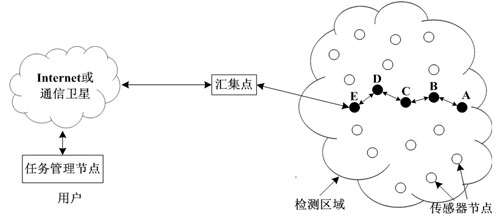 WSN是由大量傳感器節(jié)點組成的一個自組織的網(wǎng)絡系統(tǒng),每個傳感器節(jié)點都具備一定的數(shù)據(jù)采集、處理和無線收發(fā)的功能。雖然每個節(jié)點的資源和能力都非常有限,但通過節(jié)點間的有效合作,整個網(wǎng)絡能夠獨立完成大范圍、多信號的準確檢測,并及時可靠地反饋采集信息。傳感器節(jié)點布置在檢測區(qū)域;用戶在控制臺完成檢測任務分配和對WSN的管理,通過Internet或通信衛(wèi)星,再經(jīng)由匯集點發(fā)送至WSN中相關節(jié)點;相關節(jié)點采集信息并沿反向路由反饋給用戶。