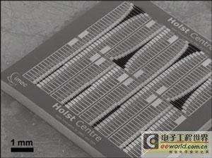 升級當前的技術(shù)(如,化學(xué)電阻或石英水晶)需要很大功率。而IMEC和霍爾斯特中心共同開發(fā)的微橋式壓差傳感器可以被嵌入在高密度排列的各個壓電電機中。該設(shè)計采用噴墨印刷技術(shù)將一系列吸收劑迅速地涂在各個微橋式壓差傳感器上。懸吊式結(jié)構(gòu)在振蕩過程中發(fā)生振動和變化,這一現(xiàn)象被監(jiān)測用作被測氣體已經(jīng)被吸收的跡象。因為這一結(jié)構(gòu)具有較高的長度-厚度比,所以要求被檢測的氣體為低濃度氣體。完整的傳感器芯片尺寸為9 × 9毫米,由160個分立式可尋址的微型機電諧振器組成,其縱橫比(長度/厚度)范圍在140~1500。