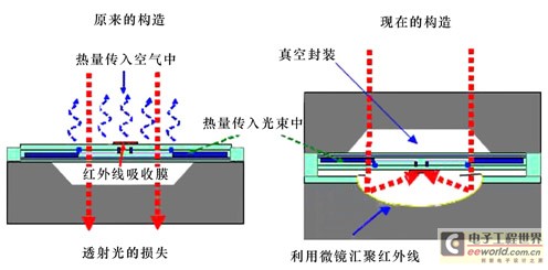 普通的非接觸溫度傳感器元件,很多紅外線都會穿透紅外線吸收膜,因而靈敏度較低。此次通過采用在開發(fā)液晶用背照燈時培育的光波控制技術,開發(fā)出了可使紅外線匯聚到紅外線吸收膜的微鏡。開發(fā)這種微鏡時,研究人員在以往很難形成曲面的硅晶圓上制作出了自由曲面。 由于可在硅晶圓上形成微鏡,因此能在晶圓級別上使傳感器元件與鏡片進行真空接合,從而減少釋放到空氣中的熱量,以此提高靈敏度?稍诒3猪憫俣炔蛔兊那闆r下將靈敏度提高至原來的7倍。這樣,便可使感應區(qū)域擴大至原來的7倍。此次開發(fā)的據(jù)該公司介紹,芯片的靈敏度為350V/W,響應速度為3ms左右。